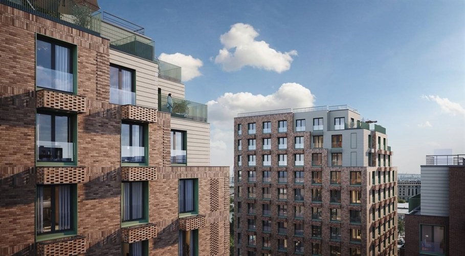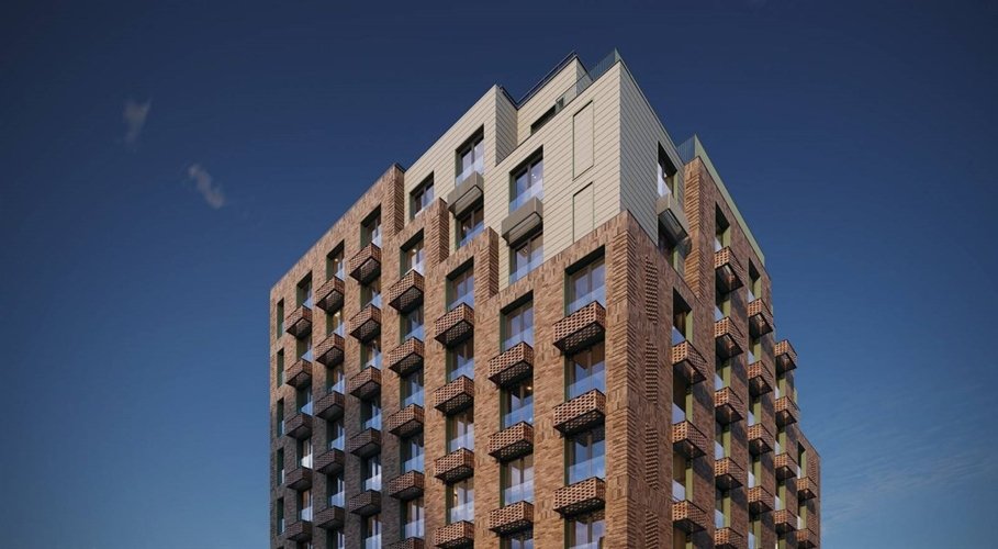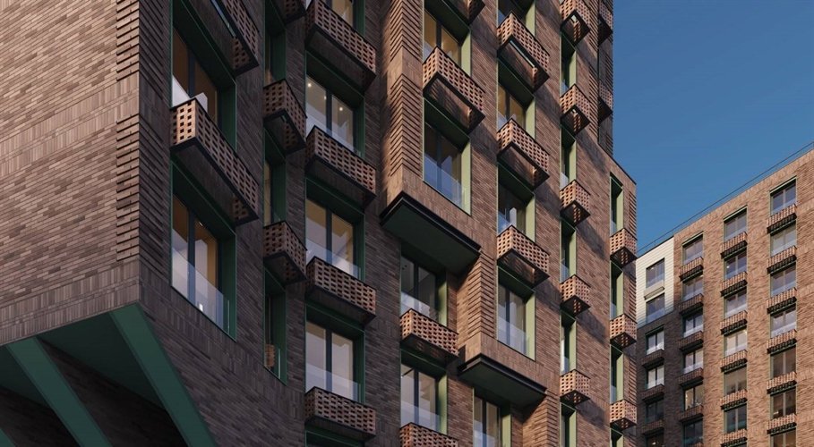 Фасады домов выполнены с контрастами темного и светлого облицовочного кирпича, и декоративной штукатурки, поддерживая исторический стиль застройки Васильевского острова.