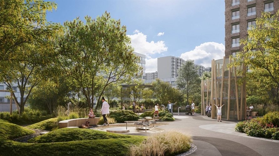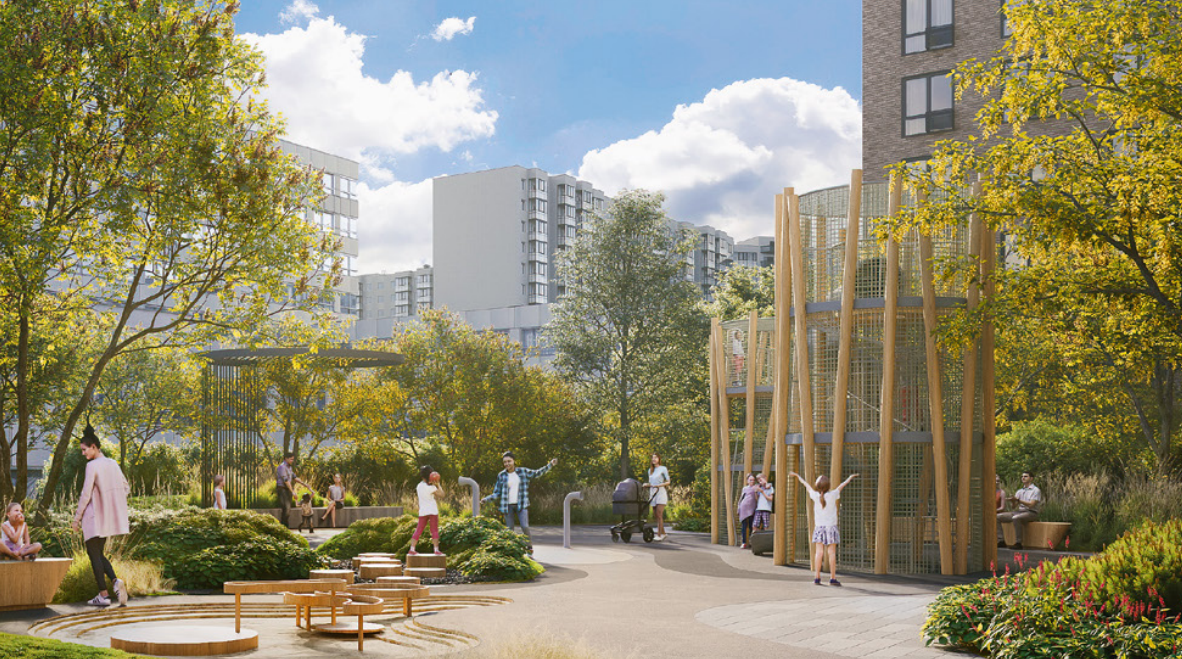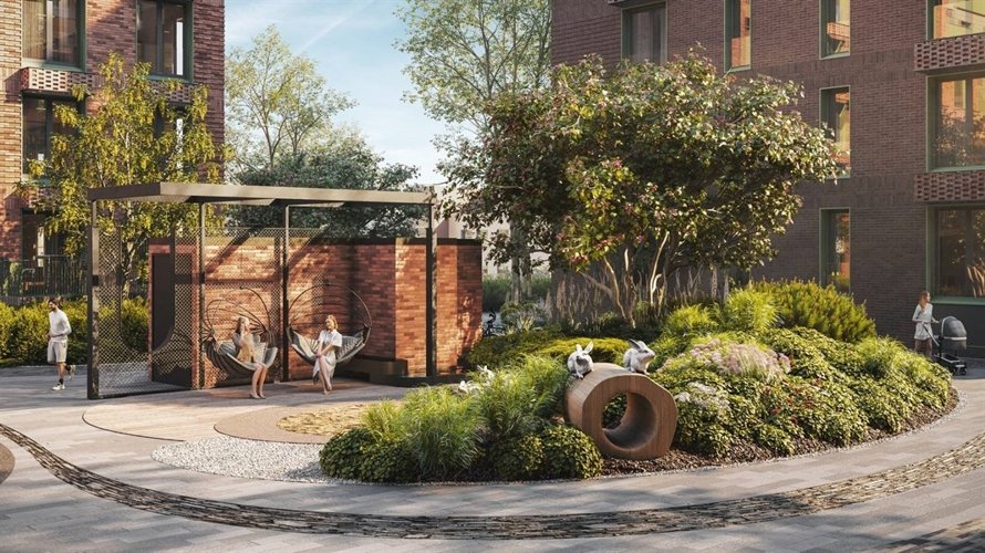 Игровое оборудование подобрано с учётом интересов различных возрастных групп. В архитектуру игровых площадок включены элементы природных форм: пеньки, брёвна, деревянные тоннели, канаты. Большая детская площадка в восточной части квартала включает элементы игры с водой и создает ощущение единства с природой.