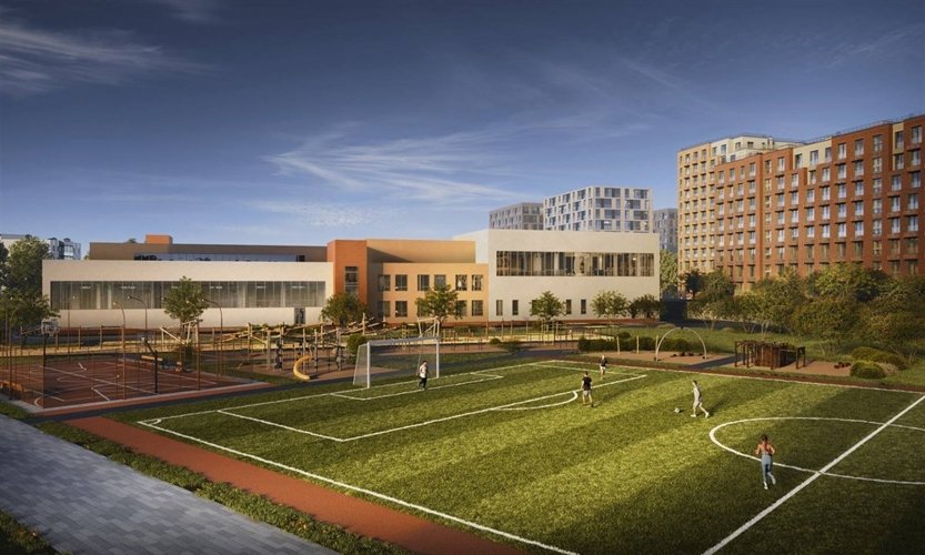 Детский сад на 280 мест и школа на 825 учащихся во дворе. В шаговой доступности находятся более десяти детских садов и школ, также запланировано строительство школы на 1375 мест в 5 минутах от квартала.