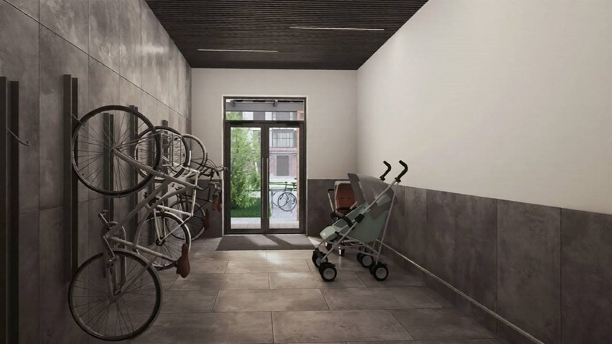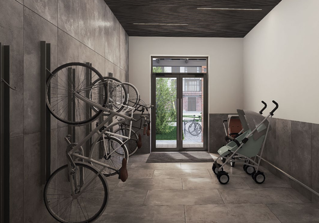 Колясочные расположены в каждой секции. Попасть сюда можно, не прикладывая повторно ключ от парадной, что более удобно для родителей с колясками. Для хранения колясок и велосипедов предусмотрены еще и велосипедные на 1 этаже, а также открытые велопарковки на территории комплекса.