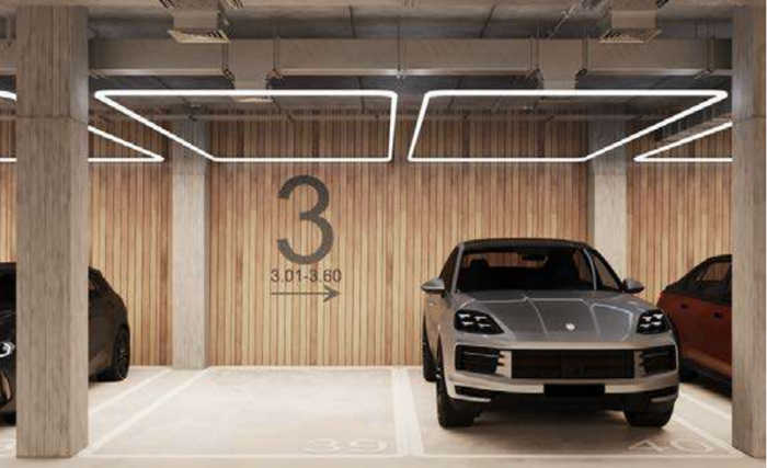 Для комфорта и безопасности автомобили размещаются на стилобатном паркинге, где фасадные модули парковки оборудованы витражами.
