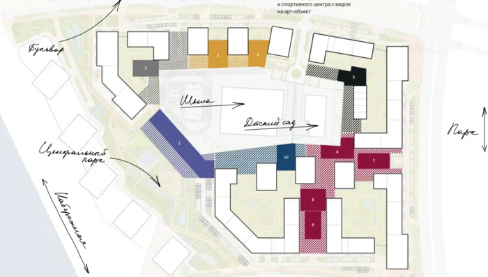 Для досуга предусмотрены разные локации с собственным назначением. Событийная - для массовых мероприятий. Гастрономическая - вкусно позавтракать или поужинать. Спортивная для здоровья и формы. Площадь спокойствия, уединения и семейная. Дворы на стилобатах, т.е. приподняты над землей, за счет чего они стали еще более приватными и безопасными.